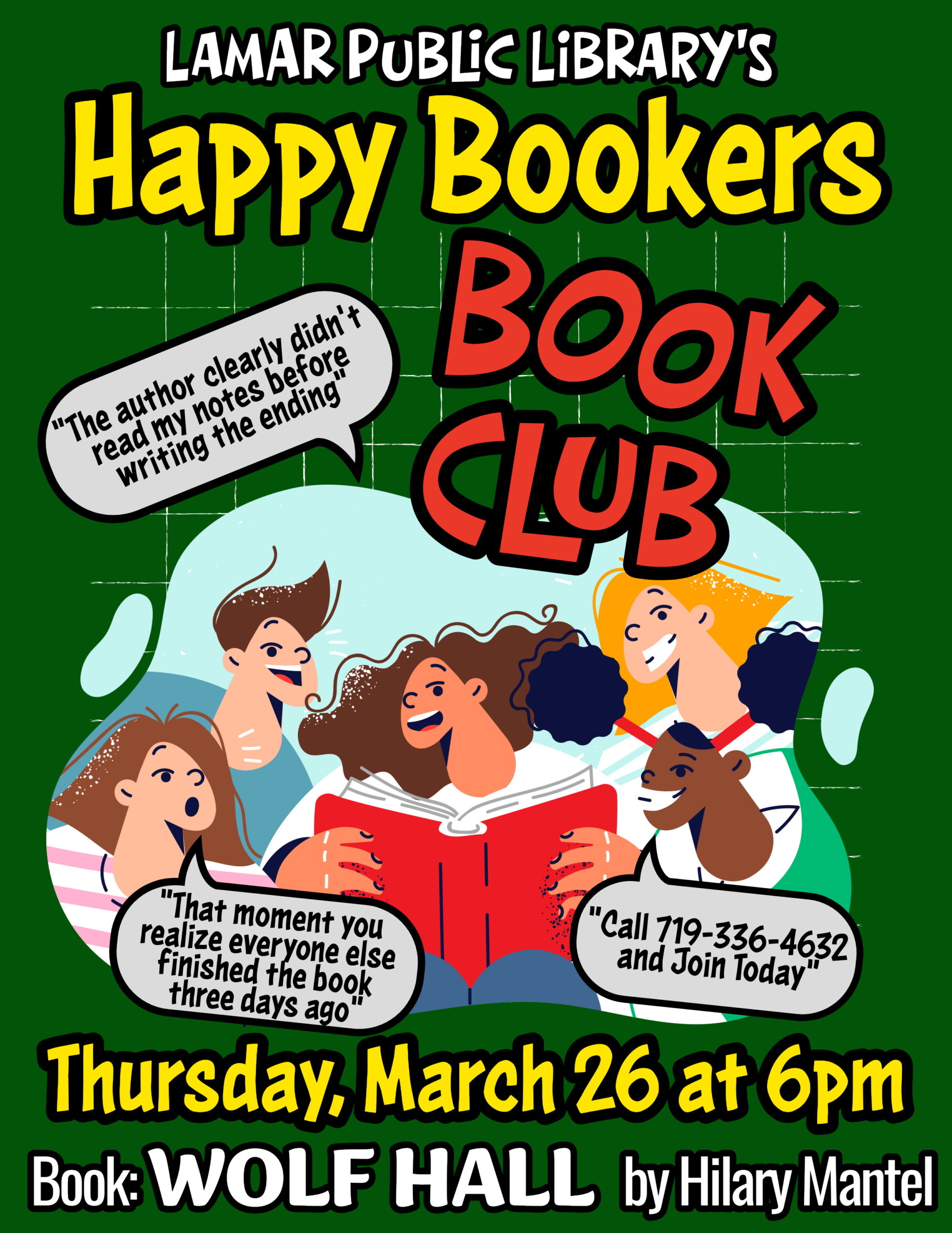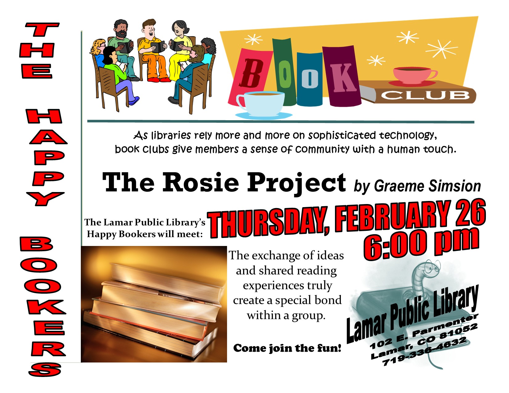 March 26, 6 p.m., Happy Bookers Book Group. Library.