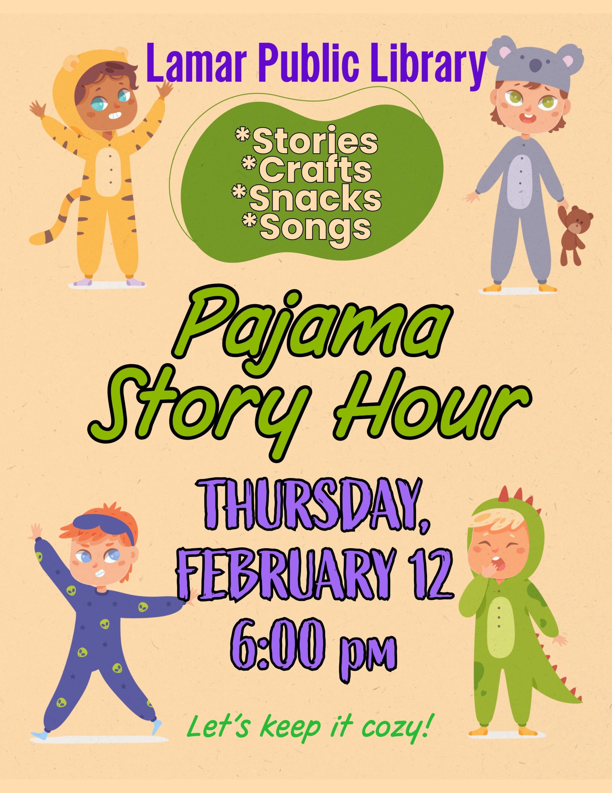 Feb. 12, 6 p.m., Pajama Story Time. Library.