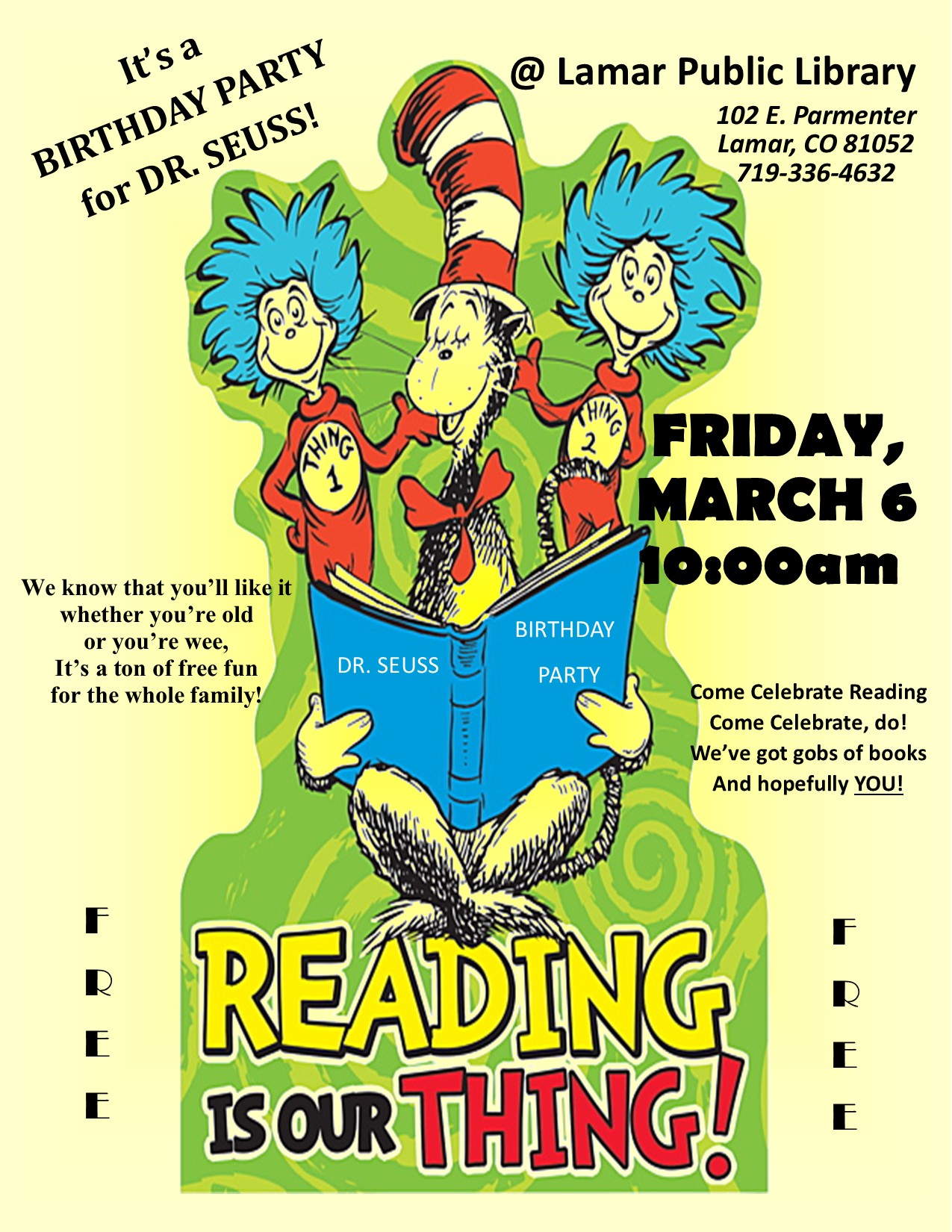 March 6, 10 a.m., Dr. Seuss Birthday Story Hour. Library.