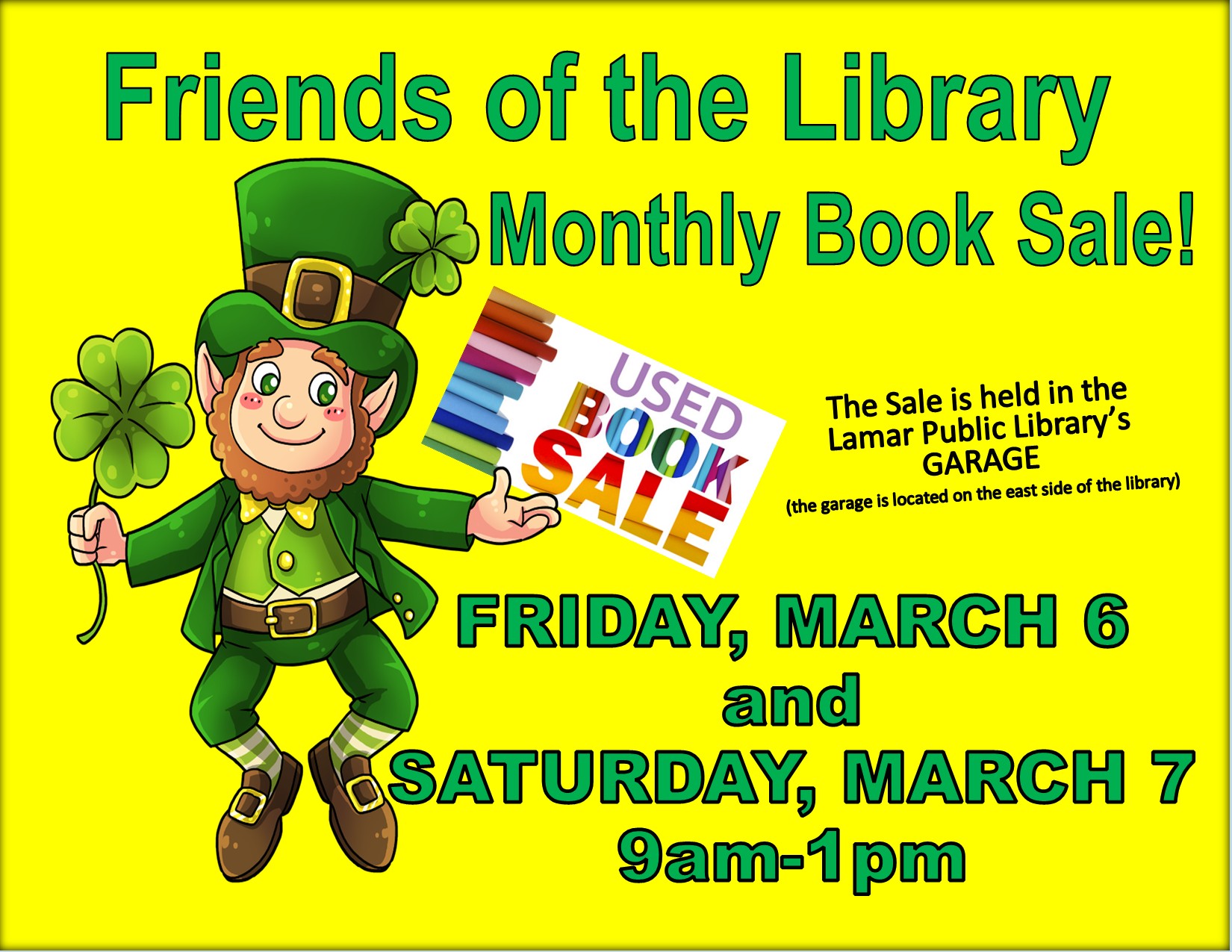March 6-7, 9 a.m. – 1 p.m., Friends of the Library Book Sale. Library’s Garage.