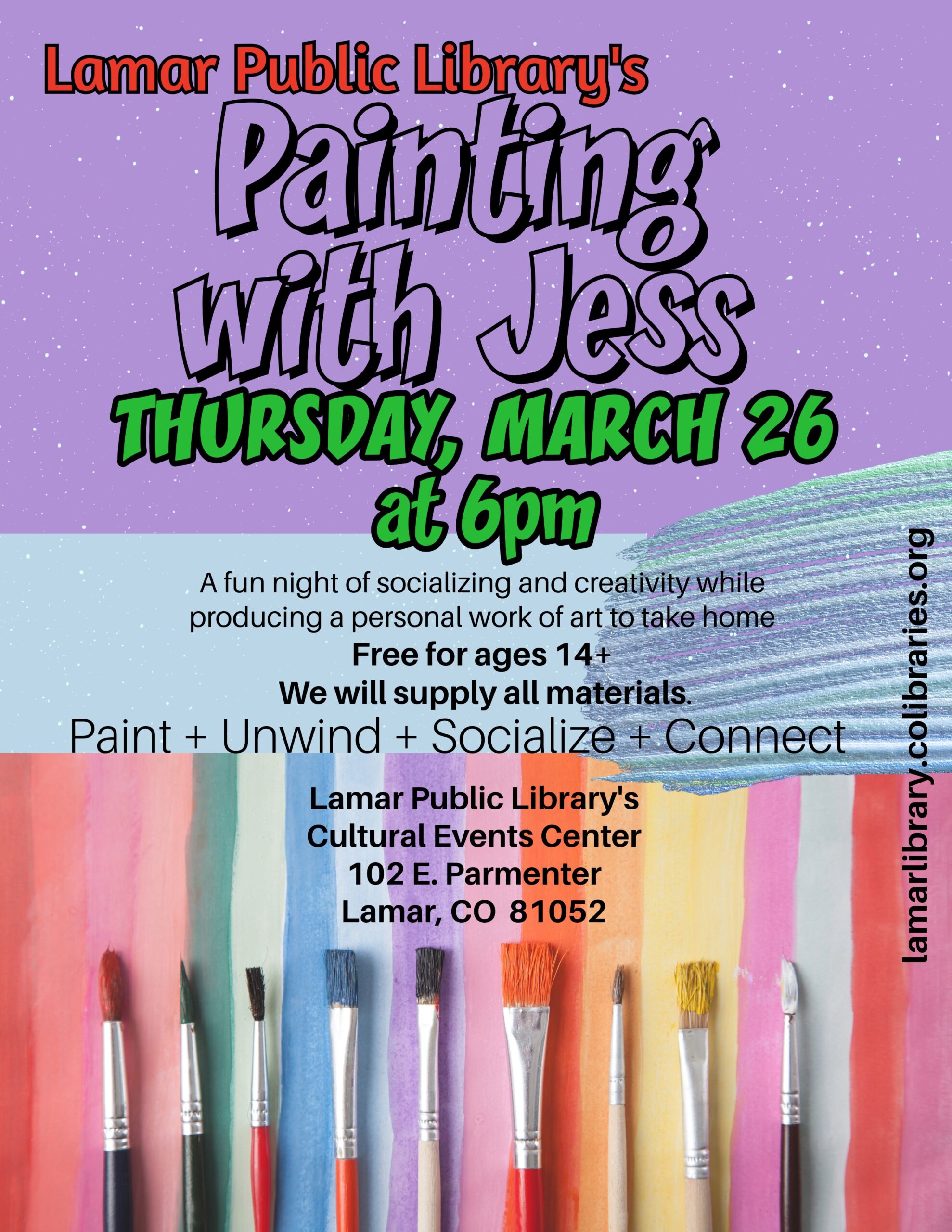 March 26, 6 p.m., Painting with Jess. Cultural Events Center.